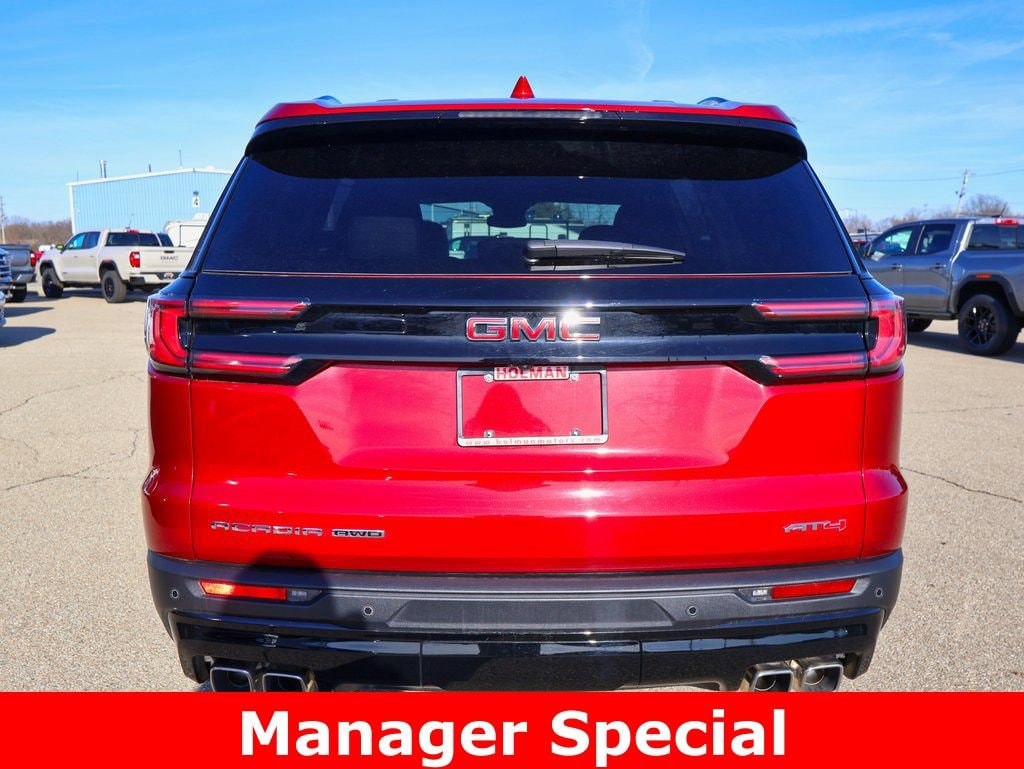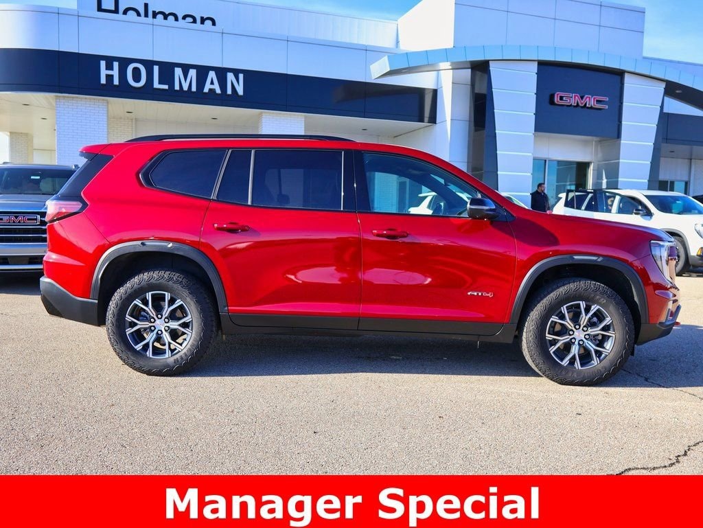 Holman Motors Inc is honored to offer this wonderful-looking 2025 GMC Acadia AT4 Retired DRAC in Volcanic Red, beautifully equipped with Floor Liner Package (1st and 2nd Row All-Weather Floor Liner and 3rd Row All-Weather Floor Liner), Preferred Equipment Group 4SB, 12 Speakers, 2-Way Driver Power Lumbar Seat Adjuster, 3 Years SiriusXM, 3.49 Final Drive Axle Ratio, 3rd row seats: split-bench, 4-Wheel Disc Brakes, 6-Way Power Front Passenger Seat Adjuster, 7-Passenger Seating (2-2-3 Seating Configuration), 8-Way Power Driver Seat Adjuster, ABS brakes, Air Conditioning, Alloy wheels, AM/FM radio: SiriusXM with 360L, Apple CarPlay/Android Auto, Auto High-beam Headlights, Auto-dimming Rear-View mirror, Automatic temperature control, Bodyside moldings, Bose Premium 12-Speaker System with Sub-Woofer, Brake assist, Bumpers: body-color, Cloth/CoreTec Seat Trim, Compass, Delay-off headlights, Driver door bin, Driver vanity mirror, Dual front impact airbags, Dual front side impact airbags, Electronic Stability Control, Emergency communication system: OnStar Services capable, Exterior Parking Camera Rear, Four wheel independent suspension, Front anti-roll bar, Front Bucket Seats, Front Center Armrest, Front dual zone A/C, Front fog lights, Front Passenger Power Lumbar Seat Adjuster, Front reading lights, Fully automatic headlights, Garage door transmitter, Heated door mirrors, Heated Driver and Front Passenger Seats, Heated front seats, Heated steering wheel, Illuminated entry, Integrated Cargo Liner, Leather steering wheel, Low tire pressure warning, Navigation System, Occupant sensing airbag, Outside temperature display, Overhead airbag, Overhead console, Panic alarm, Passenger door bin, Passenger vanity mirror, Power door mirrors, Power driver seat, Power Liftgate, Power passenger seat, Power steering, Power windows, Radio data system, Radio: 15 Diagonal Premium GMC Infotainment System, Rear air conditioning, Rear anti-roll bar, Rear reading lights, Rear side impact airbag, Rear window defroster, Rear window wiper, Remote keyless entry, Security system, SiriusXM with 360L, Speed control, Speed-sensing steering, Split folding rear seat, Spoiler, Sport steering wheel, Steering wheel mounted audio controls, Tachometer, Telescoping steering wheel, Tilt steering wheel, Traction control, Trip computer, Turn signal indicator mirrors, Variably intermittent wipers, Voltmeter, and Wheels: 18 x 8 Dark Machined Aluminum! AWD Price includes: $1000 - Buick GMC Bonus Cash. Exp. 03/02/2026