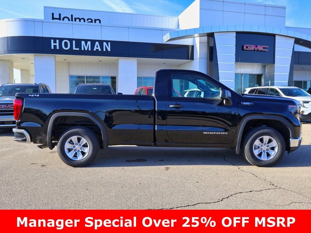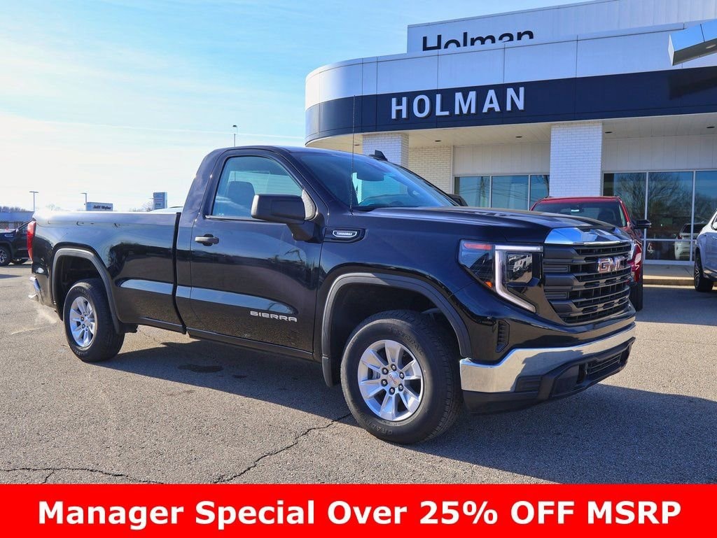 Holman Motors Inc is pumped up to offer this superb 2025 GMC Sierra 1500 Pro Retired DRAC in Onyx Black, beautifully equipped with Convenience Package (Deep-Tinted Glass, Electric Rear-Window Defogger, EZ Lift Power Lock & Release Tailgate, and LED Cargo Area Lighting), Preferred Equipment Group 1SA (2 Charge/Data USB Ports, 220 Amp Alternator, Chrome Header w/Flat Black Grille Insert Bars, Front Frame-Mounted Black Recovery Hooks, HD Rear Vision Camera, OnStar Services Capable, Power Door Locks, Power Front Windows w/Driver Express Up/Down, Power Front Windows w/Passenger Express Down, Push Button Start, Remote Keyless Entry, Solar Absorbing Tinted Glass, and Wi-Fi Hotspot Capable), Pro Value Package, Standard Suspension Package, Trailering Package (Hitch Guidance), 120-Volt Bed Mounted Power Outlet, 120-Volt Interior Power Outlet, 2 Speakers, 2-Speaker Audio System Feature, 3.42 Rear Axle Ratio, 4-Way Manual Driver Seat Adjuster, 4-Way Manual Passenger Seat Adjuster, 4-Wheel Disc Brakes, ABS brakes, Air Conditioning, AM/FM radio, Apple CarPlay/Android Auto, Auto High-beam Headlights, Auto-Locking Rear Differential, Automatic Emergency Braking, Brake assist, Buckle to Drive, Bumpers: chrome, Compass, Delay-off headlights, Driver door bin, Dual front impact airbags, Dual front side impact airbags, Electronic Stability Control, Emergency communication system: OnStar, Following Distance Indicator, Forward Collision Alert, Front 40/20/40 Split-Bench Seat, Front anti-roll bar, Front Center Armrest w/Storage, Front Pedestrian Braking, Front reading lights, Front wheel independent suspension, Fully automatic headlights, Heated door mirrors, Illuminated entry, Integrated Trailer Brake Controller, IntelliBeam Automatic High Beam On/Off, Lane Keep Assist w/Lane Departure Warning, Low tire pressure warning, Occupant sensing airbag, Outside temperature display, Overhead airbag, Overhead console, Panic alarm, Passenger door bin, Passenger vanity mirror, Power door mirrors, Power steering, Power windows, Radio data system, Radio: GMC Infotainment Audio System, Rear reading lights, Rear step bumper, Remote keyless entry, Speed control, Speed-sensing steering, Tachometer, Tilt steering wheel, Traction control, Trip computer, Variably intermittent wipers, Vinyl Seat Trim, Voltmeter, Wheels: 17 x 8 Bright Silver Painted Aluminum, Wheels: 17 x 8 Silver Painted Steel, and Wireless Apple CarPlay/Wireless Android Auto! 4WD Price includes: $1750 - Buick GMC Bonus Cash. Exp. 03/02/2026 $2750 - Buick & GMC Consumer Cash Program. Exp. 03/02/2026